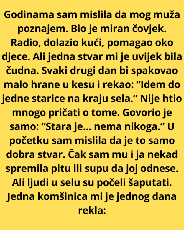 Ipak, postojala je jedna stvar koja joj je uvijek bila pomalo neobična. Svakih nekoliko dana njen muž bi spakovao kesu sa hranom i rekao gotovo istu rečenicu: ide do jedne starice koja živi na kraju sela. Nikada nije ulazio u detalje. Samo bi kratko rekao da je žena stara i da nema nikoga ko bi se o njoj brinuo.