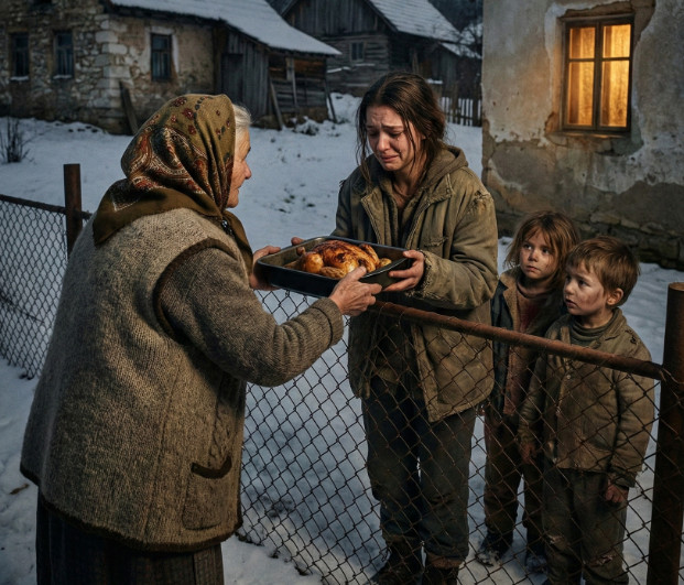 Dok su uživali u trenutku, iz susjedstva su dopirali tihi jecaji. Njihova komšinica Danijela, mlada udovica s troje djece, stajala je u dvorištu, a njena djeca su pitajući se zašto nemaju mesa, tugovala za Božićnim stolu. Danijela je pokušavala da ih tješi, ali se njen glas drhtao od emocija. Milka i Stojan su se pogledali; miris pečenja koji je donosio sreću, sada im se učinio težak poput tereta. Njihov zajednički život ih je naučio da prave vrijednosti dolaze iz srca, a ne iz tanjira. U tom trenutku, shvatili su da su, iako u teškoj situaciji, i dalje u mogućnosti da pruže ruku pomoći onima kojima je najpotrebnija.