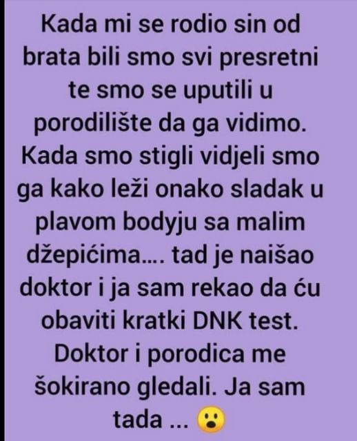 Nakon trenutka divljenja, dogodila se situacija koja je sve iznenadila. Doktor je ušao u sobu i ja, ne razmišljajući previše, iznenada sam izjavio da želim obaviti kratki DNK test na bebi. Rečenica je izazvala šok među prisutnima. Isprva su me gledali zbunjeno, a zatim se u sobi povukla tišina dok smo svi čekali moj sledeći potez. U tom trenutku, osjećao sam se kao da sam preuzeo ulogu zabavljača, donoseći trenutak humora u ovu ozbiljnu situaciju. Zaista, s obzirom na pritisak i nervozu koju su svi osjećali, bilo je potrebno malo lakšeg tona u prostoriji. Moja izjava, iako neobična, probudila je osmeh i olakšanje kod svih prisutnih.