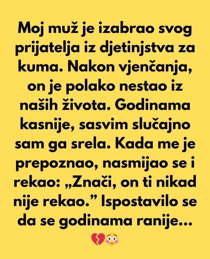 Jedna od najvažnijih odluka u životu je izbor partnera, a često se čini da ovaj izbor donosi sa sobom i neizvjesnosti koje se možda ne mogu odmah uočiti. Izbor kuma na vjenčanju može biti simbol veze i povjerenja, ali šta se dešava kada se te veze počnu raspadati? Sjećam se trenutka kada je moj muž izabrao svog najboljeg prijatelja iz djetinjstva za kuma na našem vjenčanju. Bilo je to vreme kada su svi bili sretni, a ljubav je bila na vrhuncu. No, nakon vjenčanja, taj prijatelj je počeo nestajati iz naših života, kao da je bio samo prolazna figura u našoj priči. Bilo je to vrijeme kada sam mislila da ćemo svi zajedno graditi uspomene, a umjesto toga, završila sam s osjećajem gubitka i zbunjenosti.