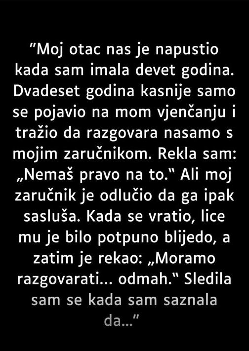 Pitao je može li razgovarati sa mojim zaručnikom nasamo. U tom trenutku, srce mi je zadrhtalo. Moje prve riječi bile su oštre i ispunjene bijesom: „Nemaš pravo na to.“ Ipak, moj zaručnik, iako je osjećao napetost u zraku, odlučio je dati mu priliku, vjerujući da bi možda mogao donijeti neku vrstu objašnjenja ili pomirenja. Njegovo povjerenje u mene i u situaciju koju nisam mogao potpuno razumjeti, pružilo mi je novu perspektivu. Možda je ova priča, iako ispunjena boli, mogla naći put ka nekom obliku pomirenja.