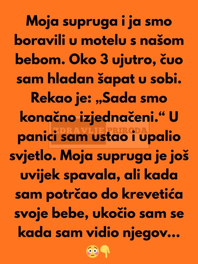 Supruga i ja smo došli u stariji motel, umorni od dugog puta, ali puni očekivanja za miran san. Moja beba je spavala u svom krevetiću, a mi smo se smestili u sobu koja je, iako stara, bila dovoljno udobna za naš odmor. Večer je prošla bez ikakvih problema, ali nešto se dogodilo kasno u noći, nešto što će nas obeležiti do kraja života.