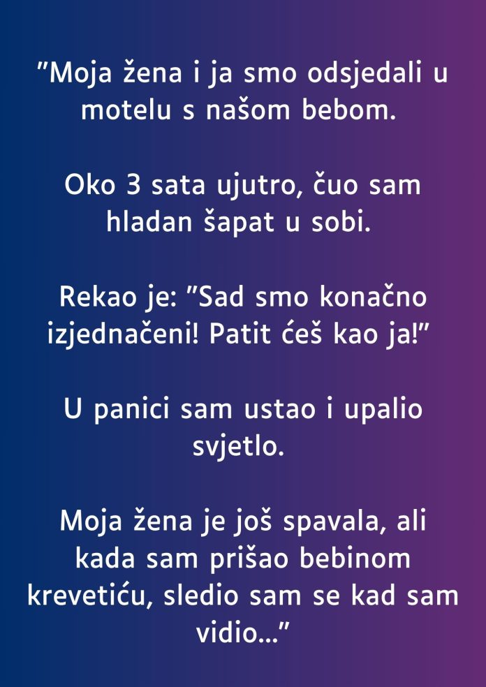 Naša odiseja počela je kasno uveče, kada smo odlučili da se zaustavimo u motelu koji je izgledao kao idealno mesto za noćenje. Zgrada nije bila velika, ali je bila čista i tiha, što je bilo ključno za naš umoran duh. Naša beba mirno je spavala dok smo mi provodili večer zajedno, uživajući u tišini i spokojstvu. Iako smo bili iscrpljeni, sve je to izgledalo savršeno. U to vreme, nisam mogao ni slutiti da već u tom trenutku, ispod te površinske sreće, nešto mračno vrebalo.