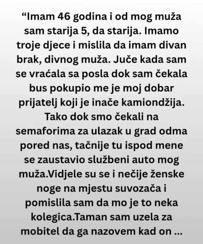 Žena koja je decenijama vjerovala u stabilnost svog braka doživjela je trenutak koji će joj zauvijek promijeniti život. Na povratku kući iz jednog običnog dana, njen prijatelj ju je ponudio vožnju prema centru grada. Iako je to trebala biti samo još jedna rutina, njena sudbina se okrenula kada se suočila s nečim što nije mogla zamisliti. Takvi trenuci otkrića obično su iznenadni i šokantni, ostavljajući osobe u stanju mentalne paralize.