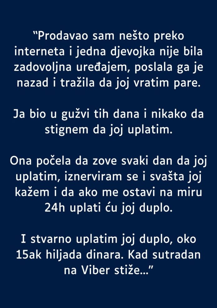 U jednom trenutku, suočen s kupcem koji je zahtijevao povrat novca za kupljeni uređaj, osjećao sam se bespomoćno. Brojni pozivi na moj telefon, zajedno s njenim zahtjevima, dodatno su pojačali moju frustraciju. Umjesto da mirno razmislim o situaciji, odlučio sam se na impulzivnu reakciju. Ponudio sam joj iznos koji je bio dvostruko veći od onoga što je tražila, samo da bih na brzinu riješio problem i dobio malo mira. Ova odluka, iako u tom trenutku činila kao izlaz, kasnije mi je pokazala koliko je važno donijeti promišljene odluke, čak i kada se suočavamo s pritiskom.