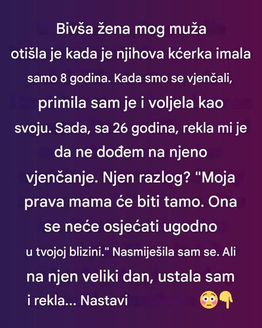Kada je došlo do venčanja, prekretnica u njihovom odnosu postala je neizbežna. Devojčica je, iznenada, izrazila želju da maćeha ne prisustvuje ceremoniji. Njene reči su bile kratke, ali snažno su udarile, stvarajući pregradu između dve žene koja do tada nije postojala. Iako je maćeha želela da bude prisutna u njenom životu, želela je da je podrži, osećala je da je njena uloga bila važna, ta odluka je pokazala koliko su složeni odnosi u porodici i koliko često ljubav nije dovoljna.