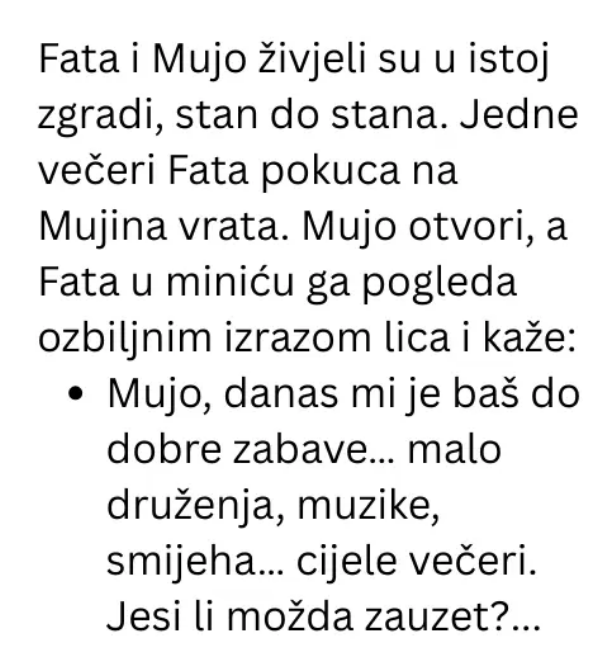 Fata i Mujo su bili susjedi koji su živjeli u istoj zgradi, a njihovi susreti su se obično svodili na kratke razgovore u liftu ili na hodniku. Njihova interakcija, iako kratka, bila je ispunjena simpatičnim dosjetkama i osmijehom. Međutim, jednog popodneva, sve se promijenilo kada je Fata odlučila da posjeti Mujina vrata. Obučena u minić, s osmijehom na licu i nekom muzikom koja se čula iz daljine, Fata je pokucala, a Mujo, iznenađen njenim izgledom, otvorio vrata. Taj trenutak bio je prepun neizvjesnosti i iščekivanja, a Mujo nije mogao ni zamisliti šta će se desiti.